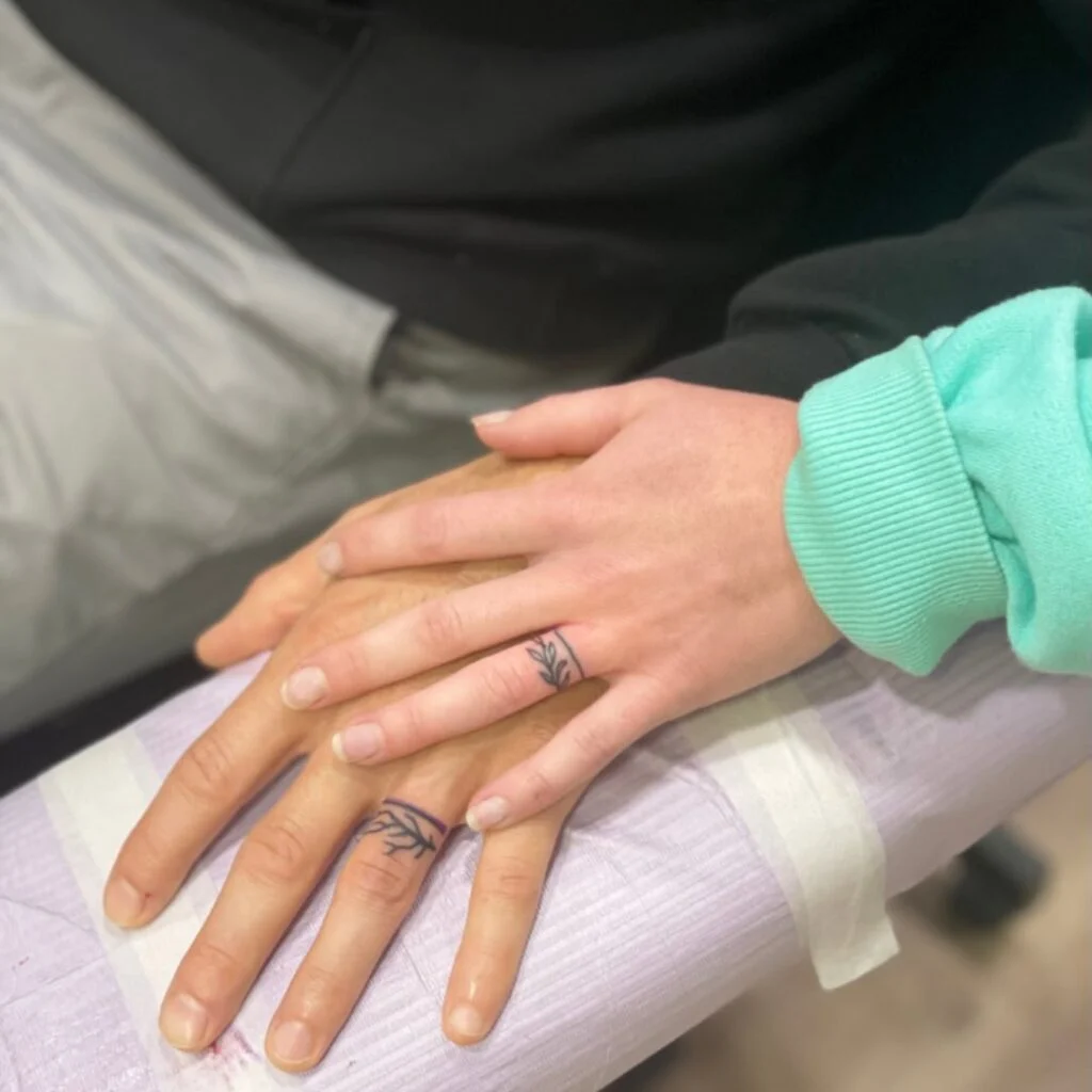 These matching wedding ring tattoos feature delicate leafy vine patterns wrapping gently around the ring fingers. Each design includes a thin line above the botanical detail—adding a subtle touch of balance and symmetry.
