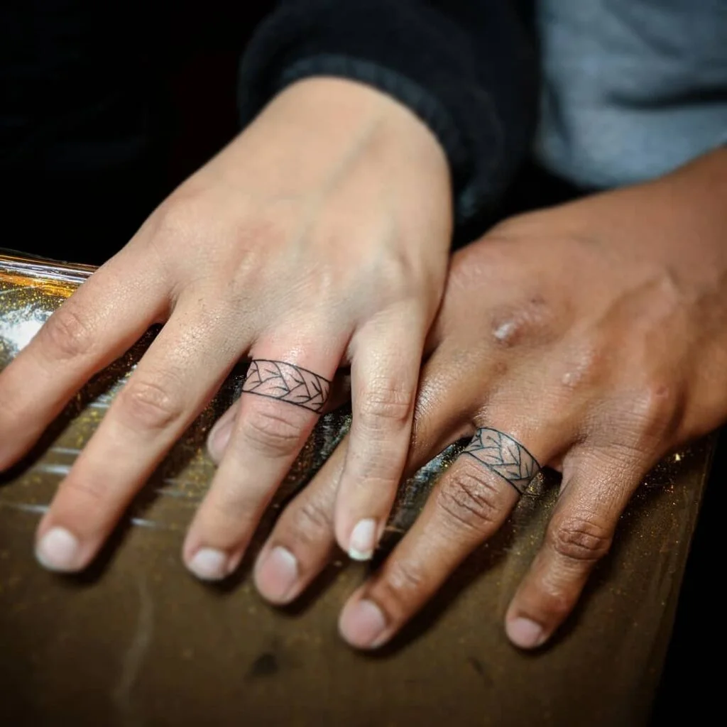 One finger also includes a bold initial “B,” adding a deeply individual touch. These tattoos go beyond simple rings—they’re wearable art that honors heritage, connection, and devotion. Perfect for couples who want a bold, meaningful alternative rooted in tradition.