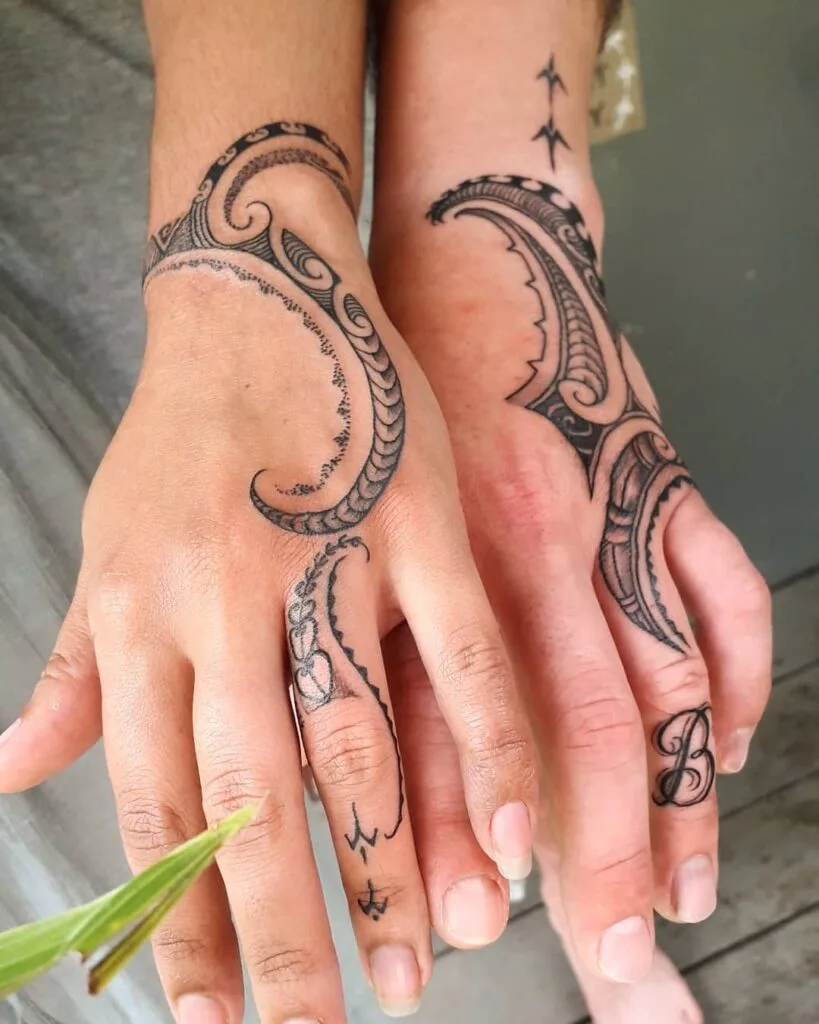 This powerful couple’s tattoo features Polynesian-style motifs flowing from the fingers up to the hands, creating a unified, artistic expression of love. Intricate tribal patterns and curved shapes wrap around the ring fingers and hands, blending cultural symbolism with personal meaning.