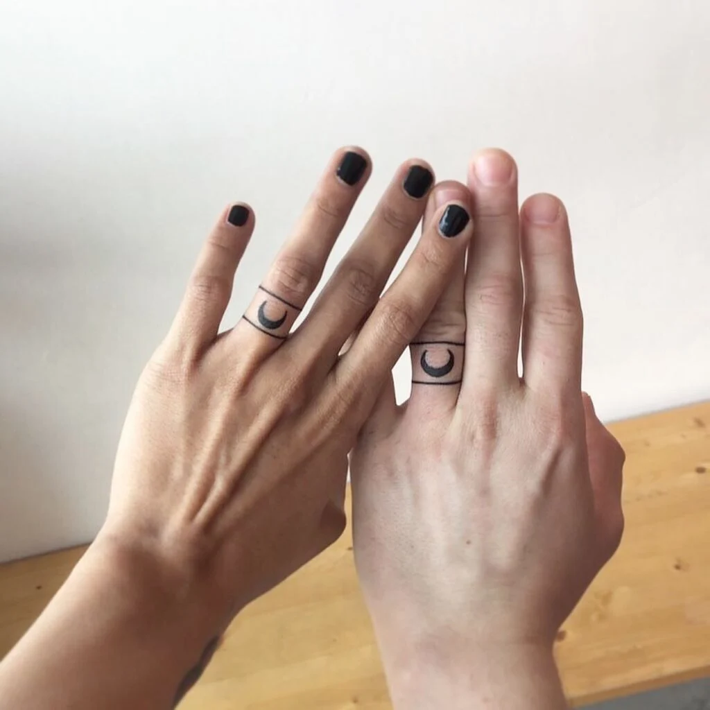 These matching finger tattoos feature a crescent moon enclosed within a thin rectangle, positioned where a wedding ring would typically sit. The crescent symbolizes cycles, intuition, and lasting emotional connection—making it a meaningful choice for couples who share a deep spiritual or symbolic bond.