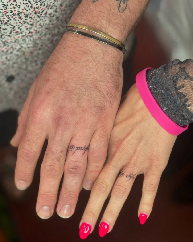 This couple chose delicate script tattoos on their ring fingers as a lasting tribute to their love. The handwritten-style ink flows with elegance, each tattoo forming part of a shared phrase or complementing message.