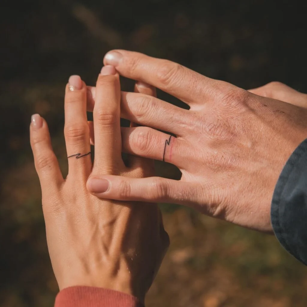 These wedding ring tattoos feature a minimalist single-line design that wraps subtly around the finger and meets in a pulse-like zigzag. The simple yet powerful style symbolizes two lives with unique paths that now beat as one.