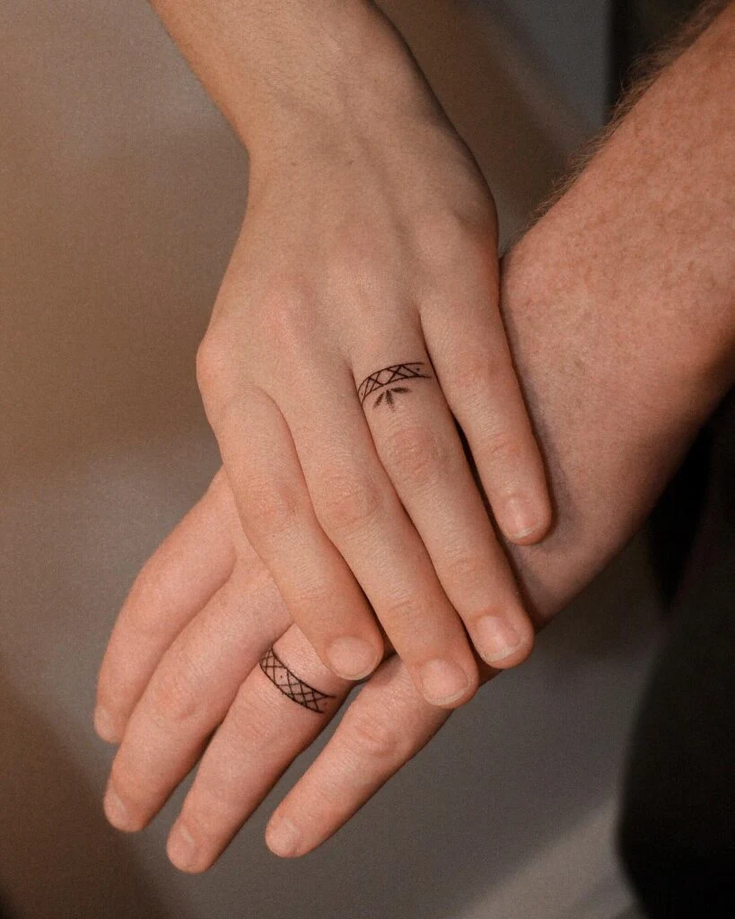 These matching wedding ring tattoos feature bold black bands filled with a geometric leaf pattern, wrapping perfectly around the ring fingers. The design blends nature with symmetry, representing growth, strength, and partnership.