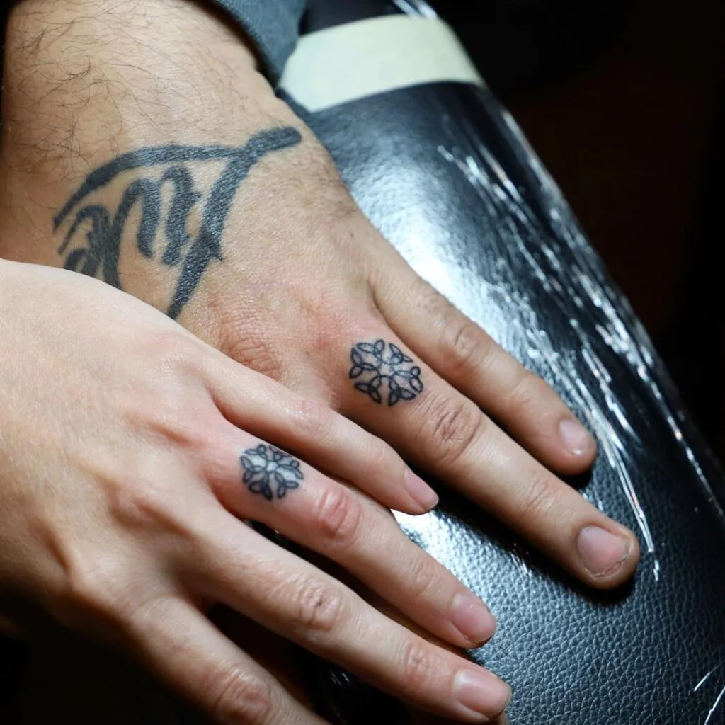 This couple chose matching floral tattoos on their ring fingers with a bold geometric twist. Each design features a symmetrical flower made of overlapping lines and petal-like shapes, blending softness and structure in one meaningful symbol.