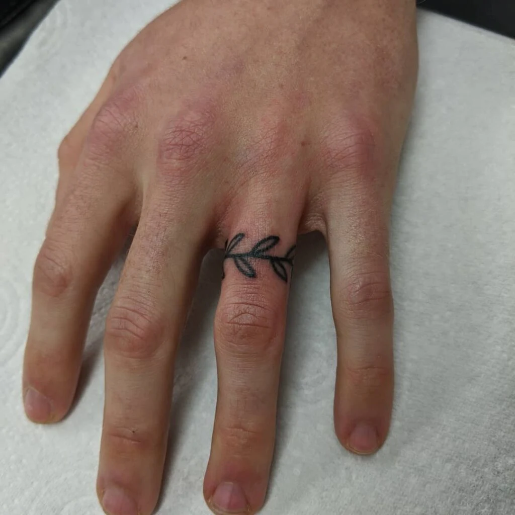 This tattoo wraps the ring finger with a delicate vine and leaf design, offering a nature-inspired twist on the traditional wedding band. The curved leaves symbolize growth, connection, and the natural evolution of love over time.