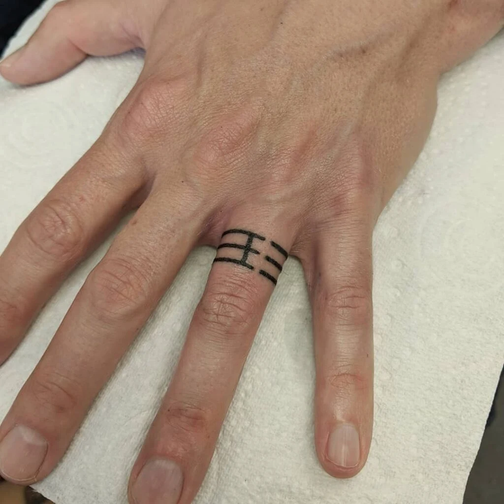 This tattoo design features three bold horizontal bars linked by a central vertical line, creating a structured and symbolic look. Placed on the ring finger, the interconnected lines can represent unity, strength, and balance in the relationship. The minimalist pattern echoes the idea of two individuals joined through a shared foundation.