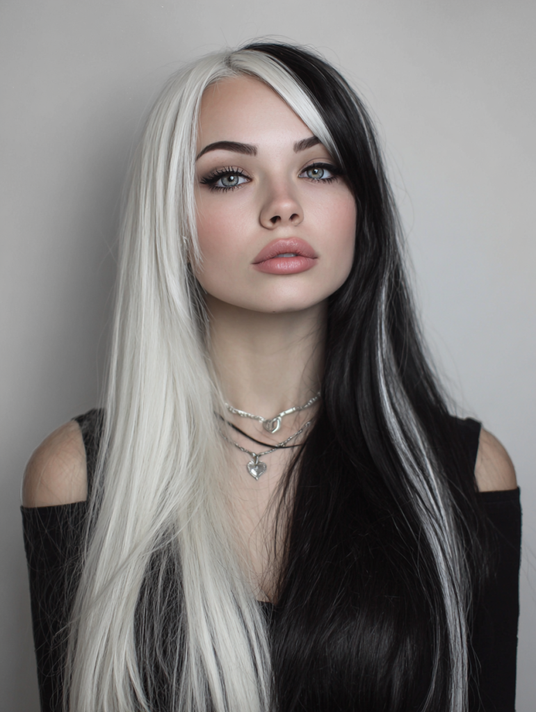 A split dye approach pushes Y2K skunk hair into full statement territory with two completely different colors divided down the middle. One side stays dark while the other shines with platinum, silver, or vibrant tones. The dramatic contrast instantly creates visual balance and attention.