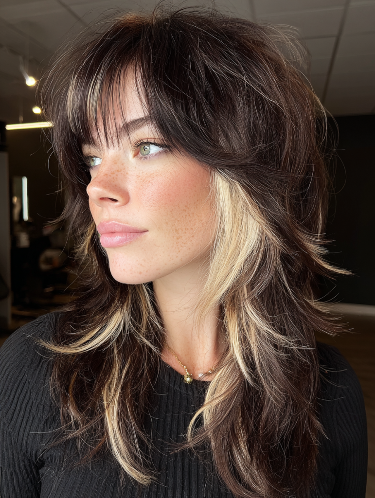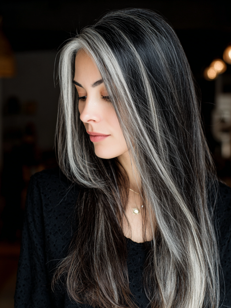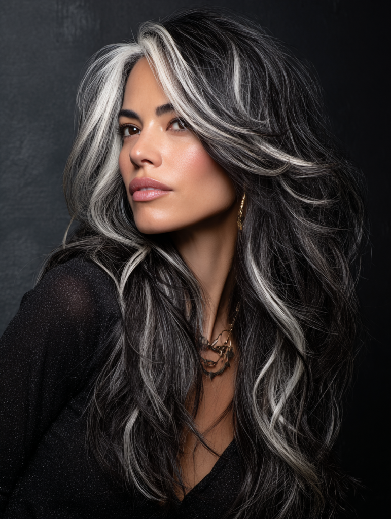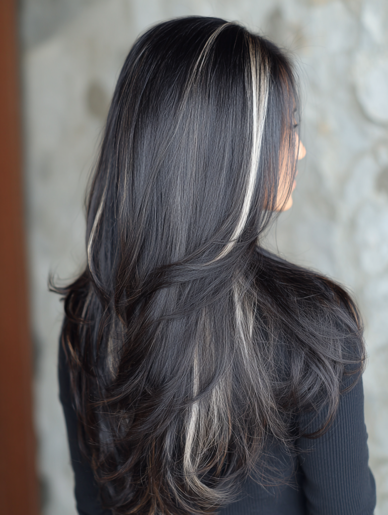 Many people choose platinum or silver streaks against dark brunette bases for maximum impact. Because the layers distribute the color evenly, the hairstyle feels bold but still beautifully blended.