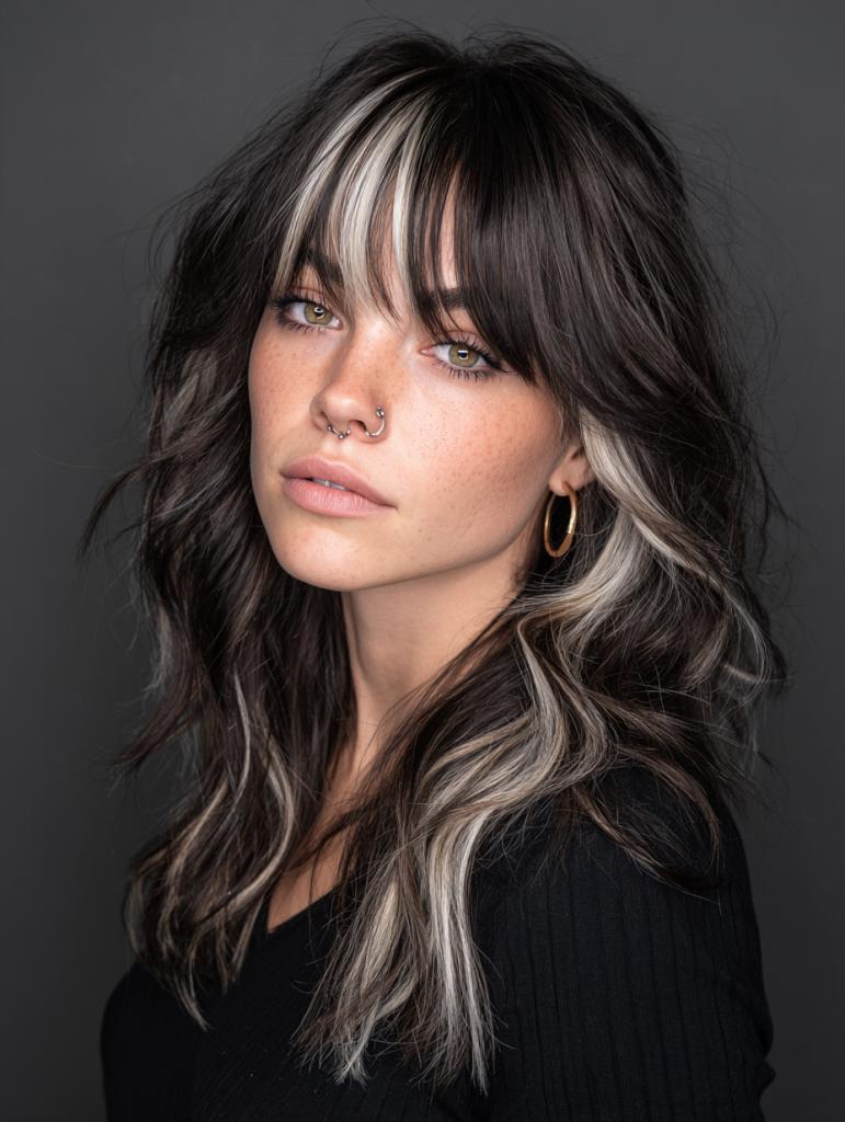 Layered shag cuts pair naturally with Y2K skunk hair because the texture helps the contrasting colors stand out. Choppy layers allow light and dark strands to separate slightly, creating depth throughout the style. Platinum streaks running through darker hair add movement and visual energy.